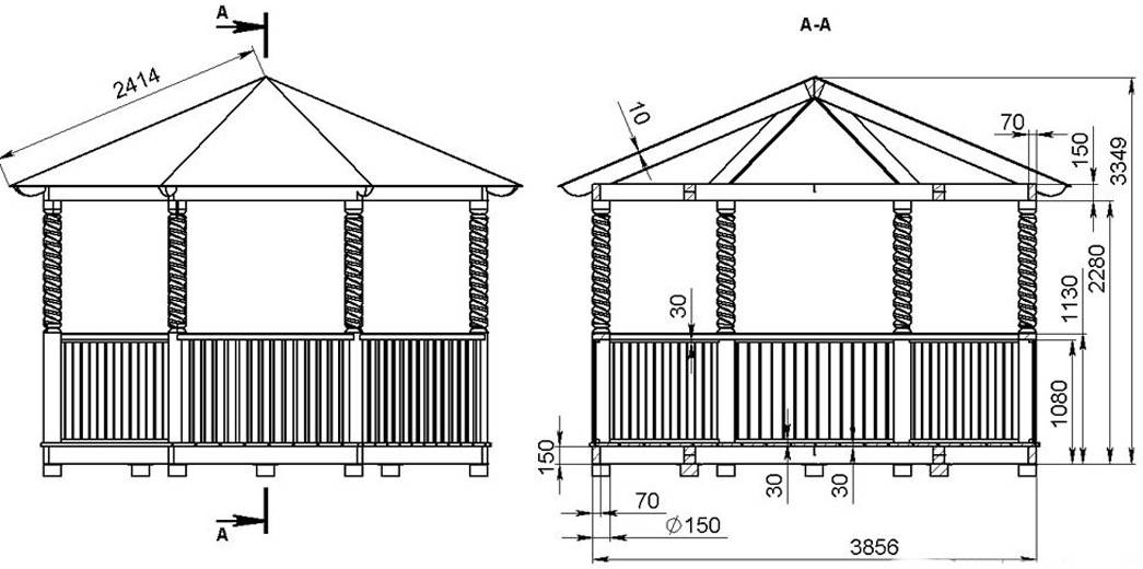 Чертеж может быть разнообразными. Некоторые мастера создают оригинальные беседки, которые оснащены бербекю зонами. Первоначально создается простой эскиз в 2 проекциях: профильной, фронтальной.