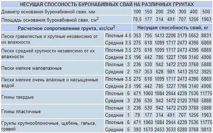 Диаметр сваи подбирается согласно действующим СНиП после геодезических изысканий, учета климатических и геологических особенностей. Непосредственно при проектировании рассчитывается масса здания, количество опор и определяется тип грунта. Информацию о несущей способности буронабивных свай на разных грунтах можно найти в таблице: