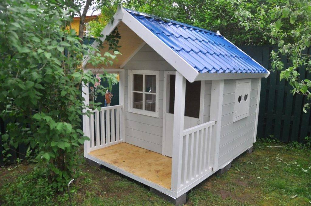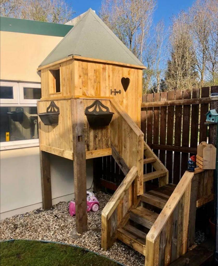 Типовой домик их окрашенных поддонов, который представляет собой масштабированную копию реального жилого дома. Внутри всего одно помещение, которое позволяет комфортное нахождение малыша.