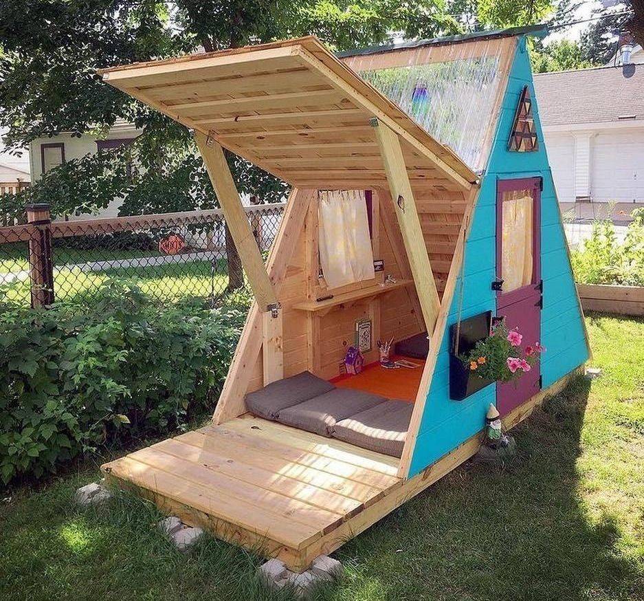 Домик-чум с откидной стенкой. Второе название такого типа детских домиков – трансформер. Возводится из двух щитов, которые сколачиваются из досок поддона, а потом смыкаются вершинами. Детям такая форма дома и откидная стенка покажутся особенно интересными.