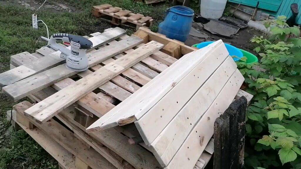 Ошкурив и зачистив все неровности и шершавые поверхности, можно приступать к скреплению поддонов между собой. Классическая конструкция представляет собой расположение паллетов в 2 слоя, друг на друге. Это позволит обеспечить достаточную высоту, крепость и надежность.