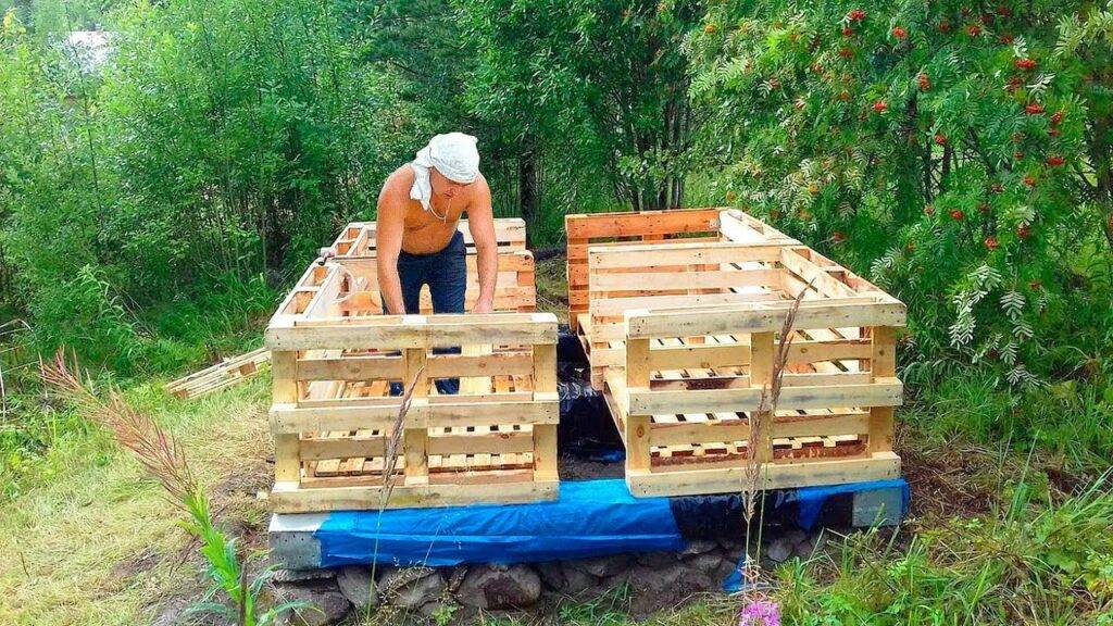 Некоторые пользователи упрощают и ускоряют процесс, собирая из паллет опорные столбы по углам и устанавливая тонкие простенки из вертикально установленных поддонов.