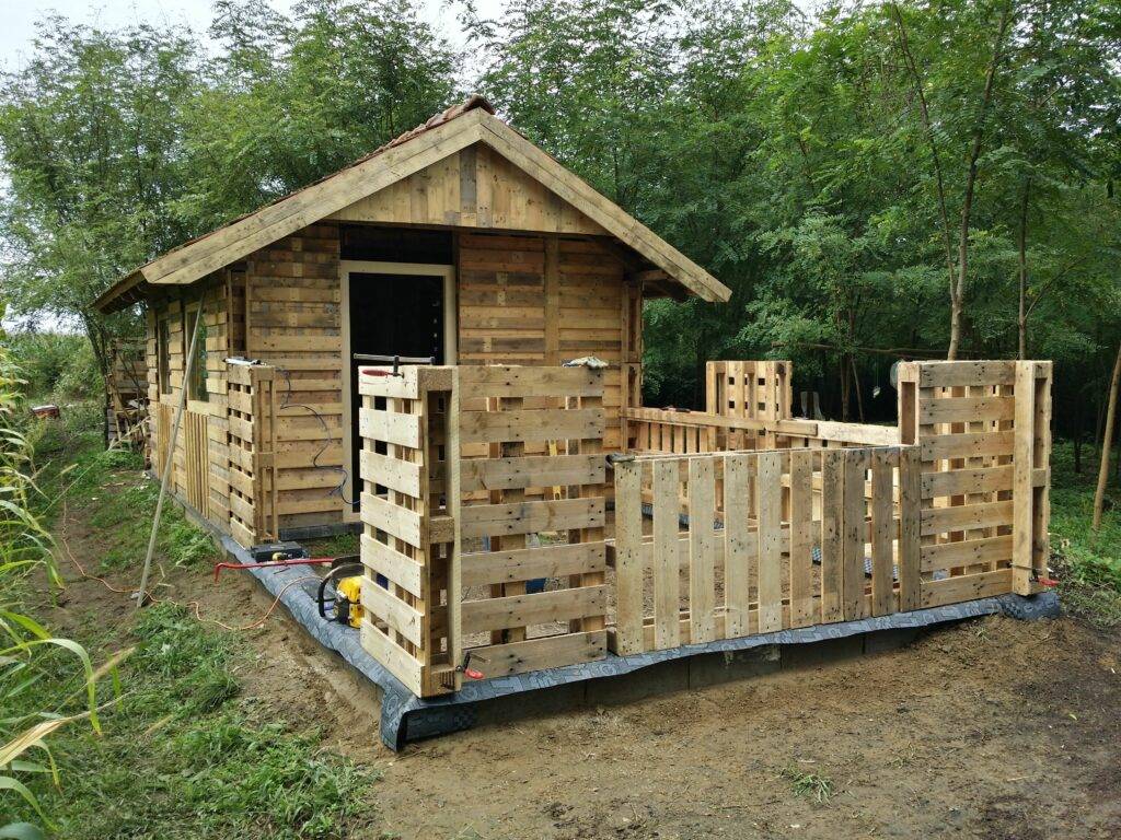 Типовой домик их окрашенных поддонов, который представляет собой масштабированную копию реального жилого дома. Внутри всего одно помещение, которое позволяет комфортное нахождение малыша.
