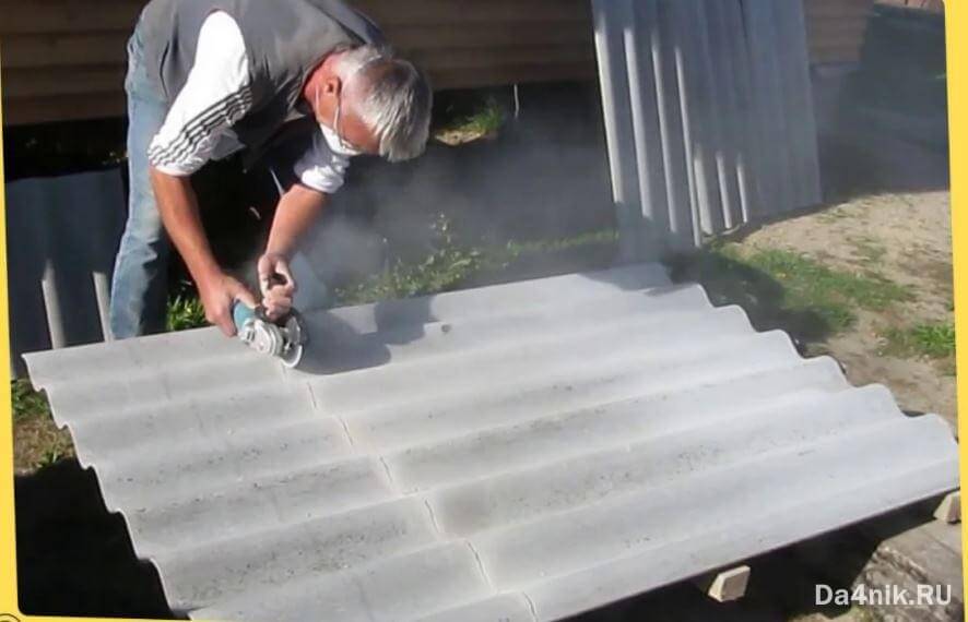 Одной из самых сложных задач является нарезка шифера, но не потому, что его сложно раскроить на фрагменты. Современные инструменты позволяют сделать это быстро и легко. Одним из них является болгарка. Сложность заключается в образовании большого количества пыли. В ее составе ядовитый асбест. Разлетаясь по воздуху, загрязняется участок. Еще больше страдает сам человек. Чтобы пыль не попала в дыхательные пути, глаза, резку осуществляют в респираторе, очках или специальной маске.