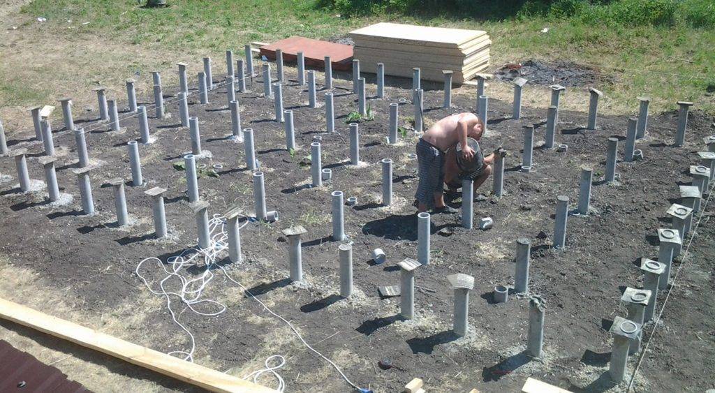 Для возведения столбчатого основания фиксируют столбы в определенных местах: в углах и перекрытиях. Столбы могут быть сборные или заливные из цемента. Заливные столбы делают как при ленточном типе. Выкапывают ямки и устанавливают опалубку в них, после чего гидроизолируют ее. Чтобы фундамент был прочным необходимо немного утопить арматуру.