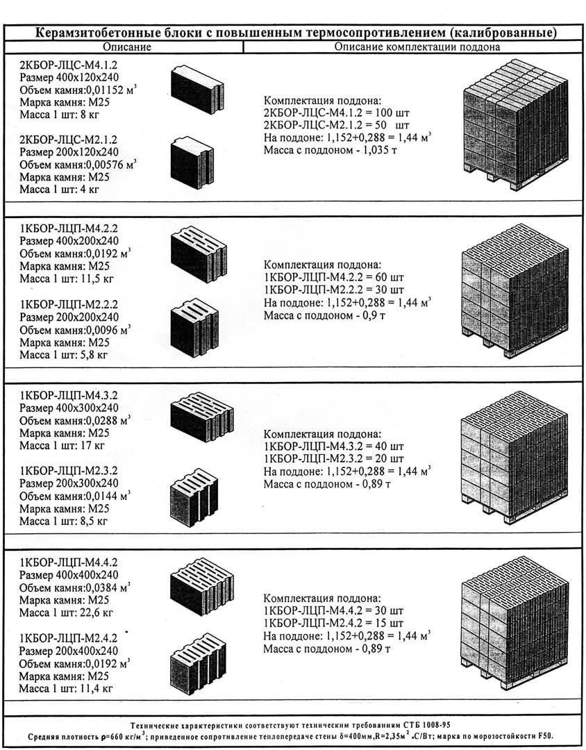 Таблица видов и характеристик керамзитобетонных блоков