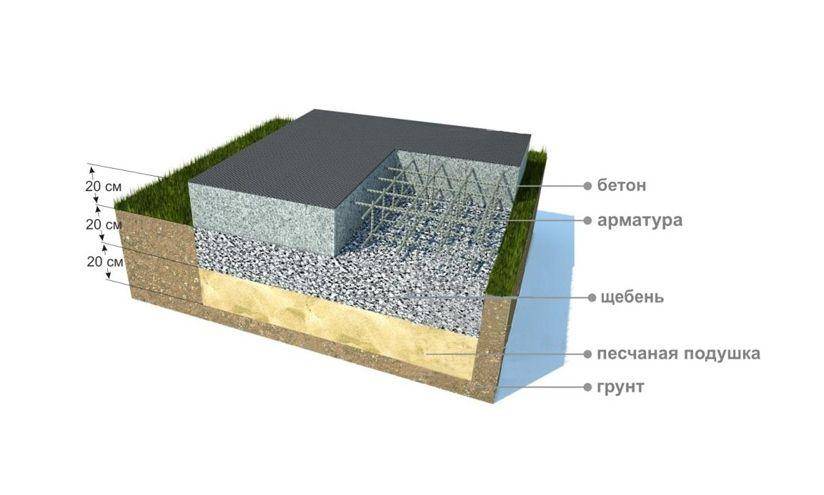 В котлован, выкопанный заранее, укладывают песок слоем 10 см и поливают водой. Сверху засыпают слой щебенки толщиной 5 см. Подушка из щебня и песка должна превышать размеры фундамента на 10-15 см по всему периметру.
