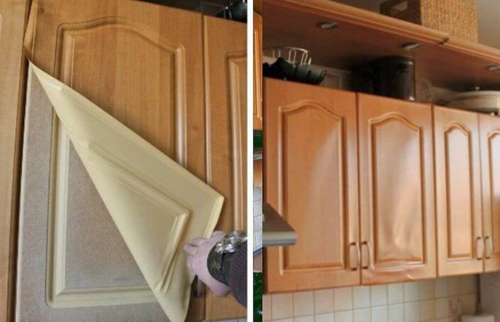 Кухонный гарнитур, оклеенный самоклеющейся пленкой с изящным рисунком, сразу же приобретает изысканный и необычный вид