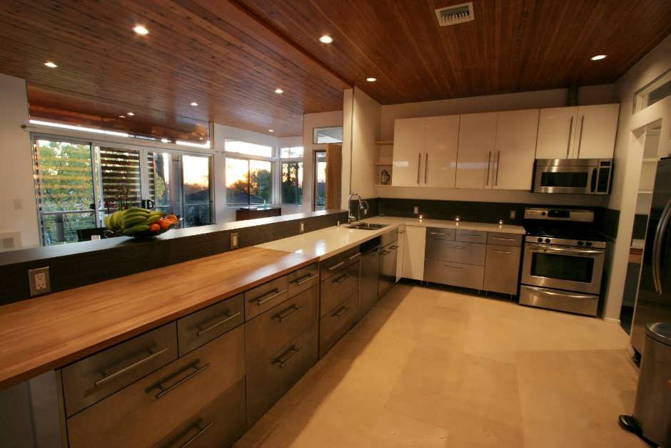 Для широких помещений свободное пространство в центре заполняется обеденным столом для членов семьи, дополнительной поверхностью для приготовления или совмещенным типом кухонной мебели.
