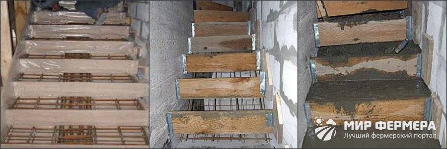 Один из самых простых способов, который, тем не менее, не прощает грубых ошибок в процессе изготовления лестницы. Начинается процесс с установки опалубки: заранее подготовленные сбитые из досок или собранные из металлического листа щиты устанавливаются в определенном порядке, так, чтобы с каждой из сторон края выступали за уровень заливаемой поверхности.
