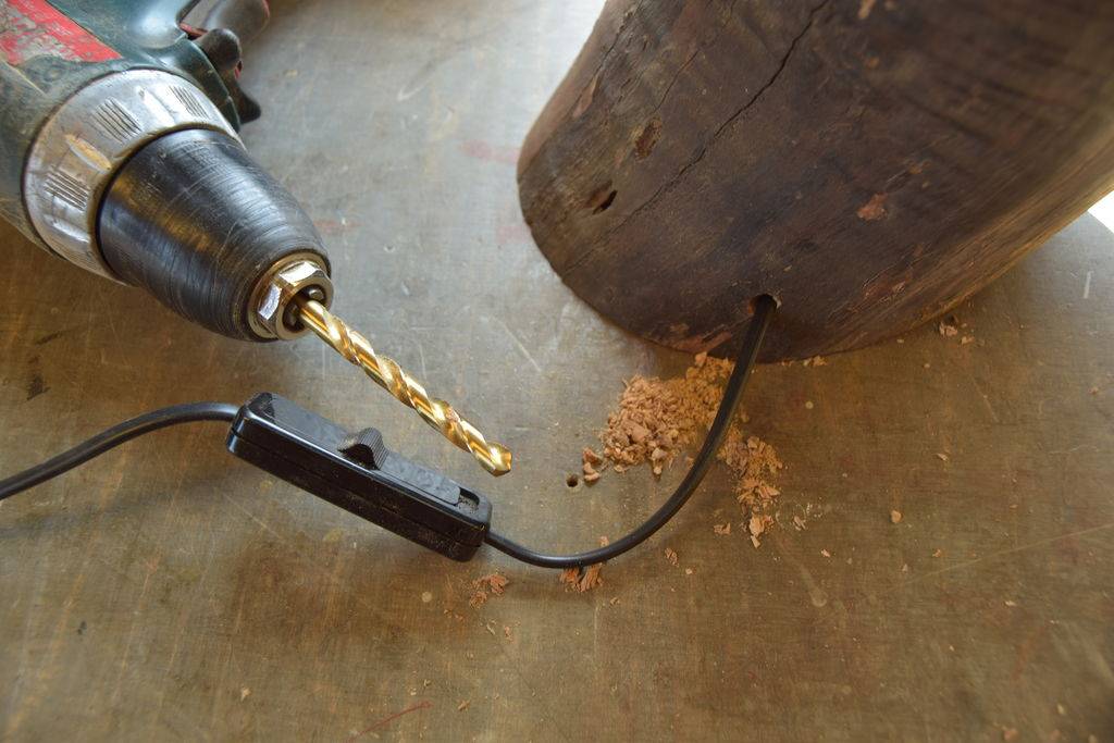 При помощи сверла и дрели необходимо создать в ветке отверстие для шнура. Это необходимо сделать до подключения розетки, чтобы вы смогли проложить шнур. Если сверла под рукой нет, то можно просто проделать небольшой паз при помощи любого острого инструмента. Установите гнездо в том месте, где вы его собираетесь зафиксировать. Это следует сделать с прикрепленной лампочкой, чтобы увидеть, будет ли она на самом деле стоять прямо.