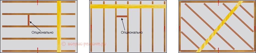 Схемы обрешеток под вертикальную, горизонтальную и диагональную обшивку даны на рис. Общий принцип – брусья обрешетки перпендикулярны доскам. Не пренебрегайте краевыми брусьями (отмечены красными !): висячих концов досок быть не должно; обрешетка под диагональную обшивку должна иметь сплошное обрамление. Толщина брусьев обрешетки – 20-40 мм; ширина 30-60 мм. Шаг установки брусьев – 4-5 ширин доски по верхней пласти.