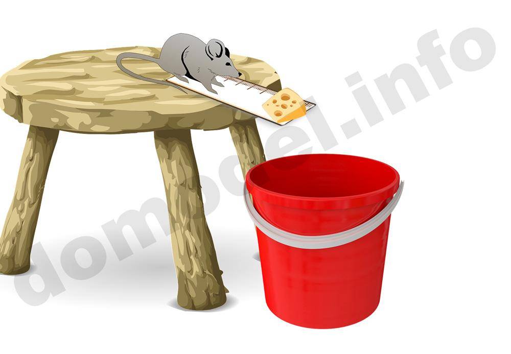 Подходит в тех случаях, если норушка любит посещать кухонный стол. На стол, не фиксируя, кладут линейку, так, чтобы большая часть ее свисала, на линейку выкладывают приманку для грызуна, а на полу у стола емкость, заполненную водой. Мышь бежит за едой, и линейка падает в ведро вместе с грызуном.