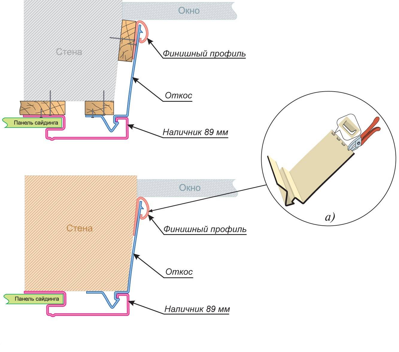 Вертикальные планки сверху обрезаются «под углом», а снизу выкраиваются с аналогичным отгибом в боку. Цель всех этих манипуляций – не просто обшить красиво дом сайдингом, а состыковать наличники так, чтобы нигде в стыки не могла просочиться вода.