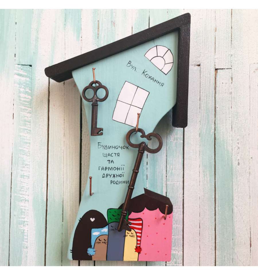 В форме маленького дома выполнена ключница из тонкой древесины. Его обитателями являются две деревянные фигурки, которые вынимаются вместе с ключами. Фронтон домика украшает маленькое сердце, а брелки выполнены в виде мужчины и женщины. Фигурки партнеров соединяются в вечернее время, когда ключи помещаются в жилище.