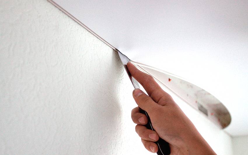 Шаг 7. Обрежьте при помощи ножа «свободный край». Чтобы было удобнее, прикрывайте потолок обычным шпателем – это позволит избежать повреждения полотна.