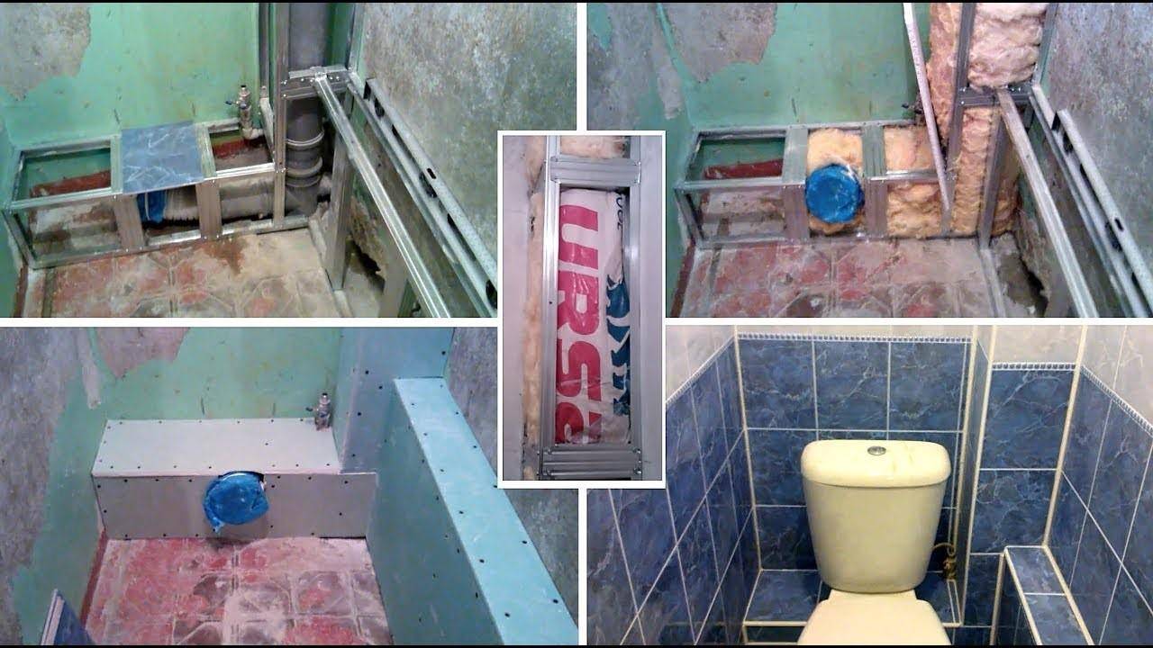 Смонтированную инсталляцию закрывают фальшь-панелью или коробом. Используют для этого каркас из металлических профилей и влагостойкий гипсокартон, на который укладывается керамическая плитка.