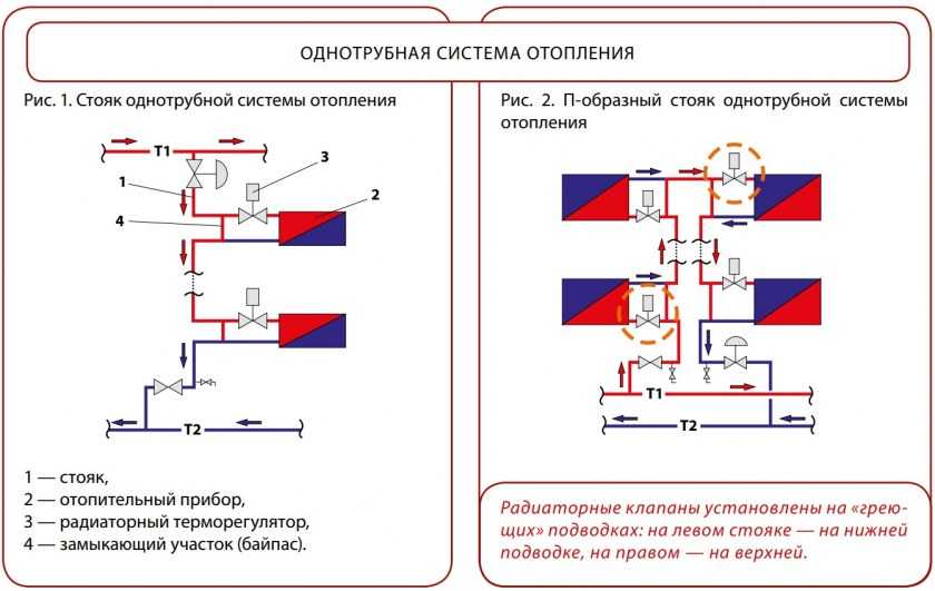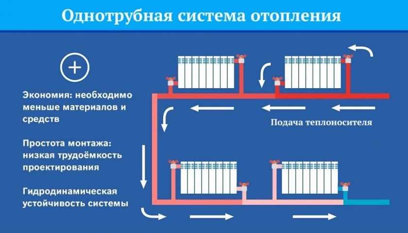 Теплоноситель подаётся к радиаторам и отводится от них по одной трубе, закольцованной на котёл. Разделяется способом розлива; верхняя подача и нижняя подача.