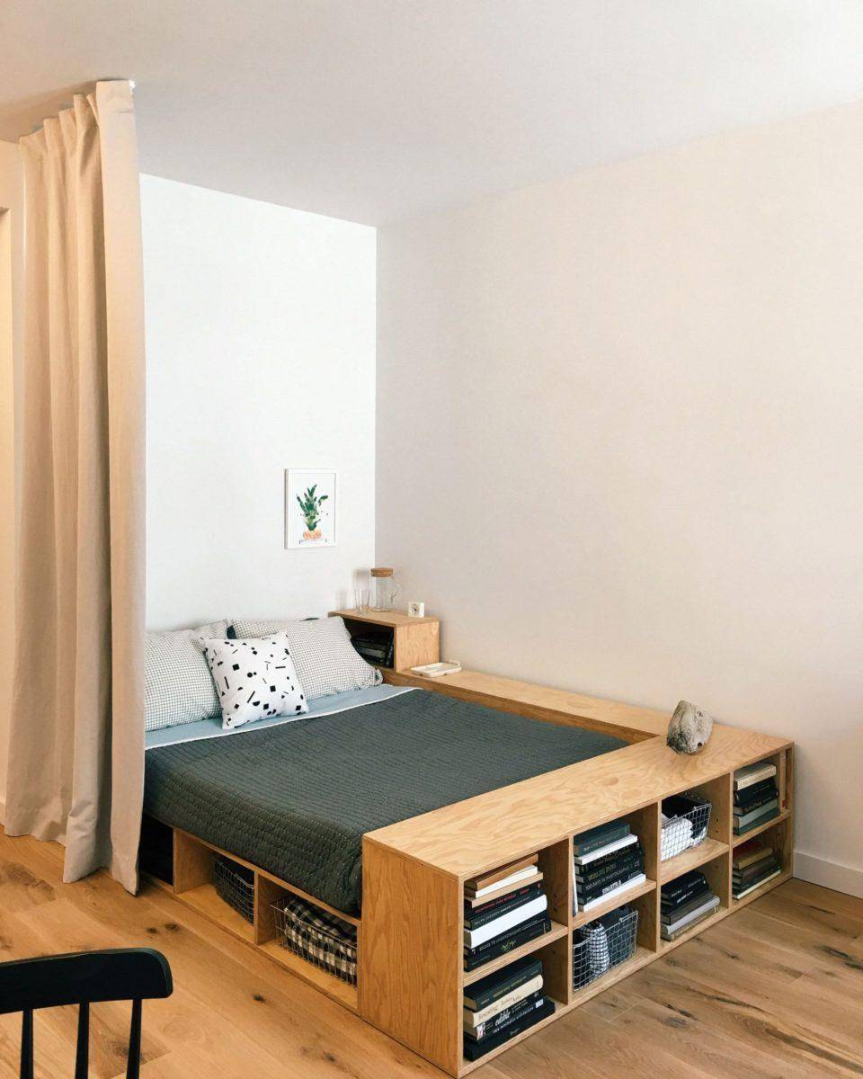 Сам подиум может превратиться в диван или даже кровать, если просто положить на него матрас. Можно обить конструкцию мягкой плотной подложкой, а сверху обтянуть тканью, чтобы получить полноценный диван. Также очень интересное решение — это встроенная кровать, которая в дневное время прячется в подиуме.