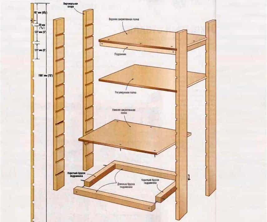 Легкая обработка и установка стеллажей. Требуется минимальный набор инструментов и минимальные навыки. С сооружением стеллажа из дерева справится и новичок.