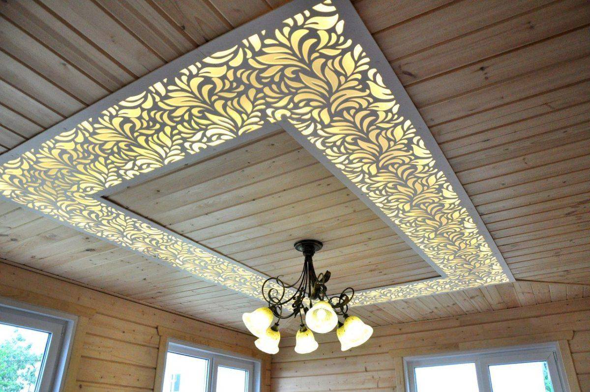 Решить данную проблему можно, если использовать отделку из досок разного цвета. Этот прием позволяет разделить пространство помещения на несколько функциональных зон – он особенно актуален при оформлении зала или гостиной. Разнообразить потолочную отделку можно с помощью узоров, росписи или резьбы, нанесенных на вагонку перед началом ее монтажа.