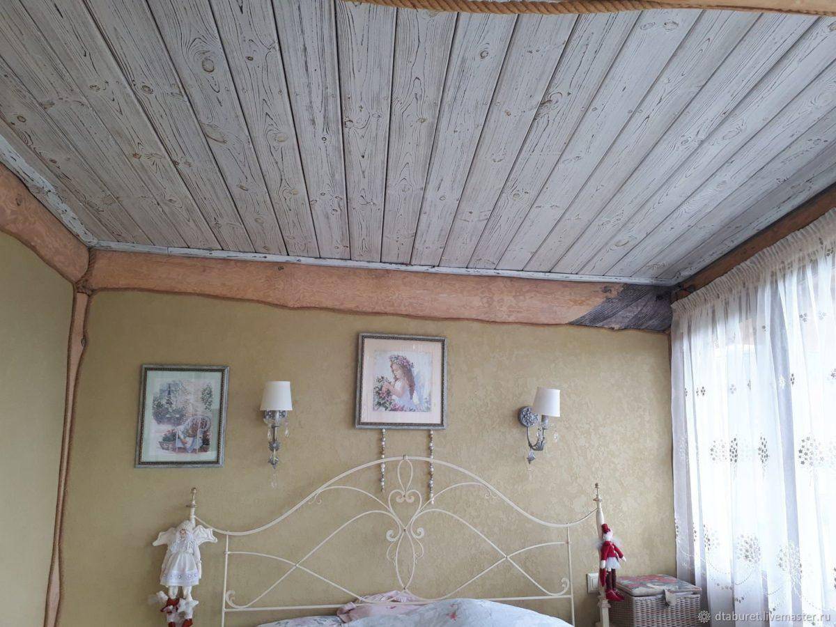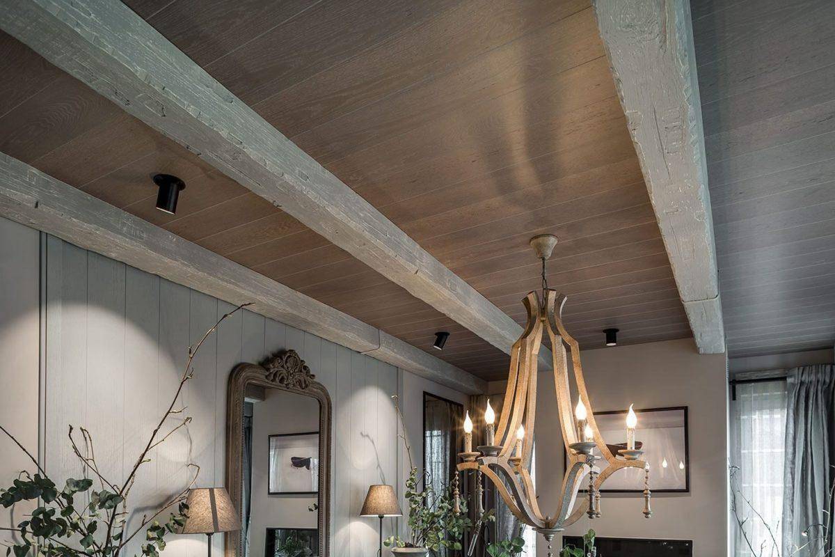Существует еще один оригинальный способ оформления потолка в деревянном доме. Он заключается в том, что планки с внешней стороны нужно искусственно состарить. В итоге интерьер комнаты напоминает атмосферу старинного особняка.