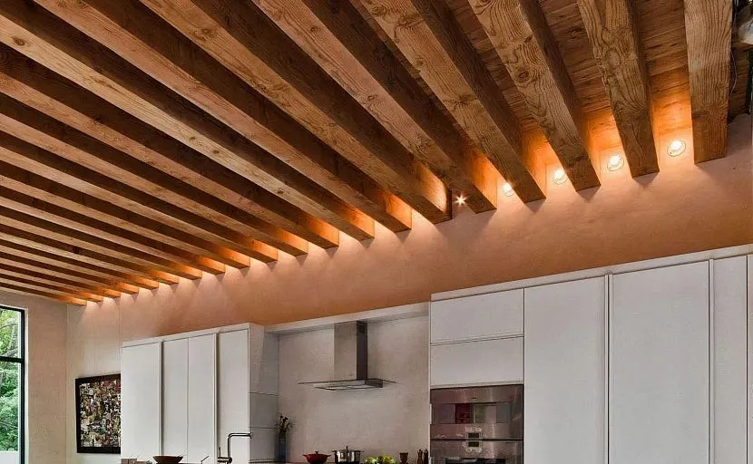 - Не слишком высокая стойкость к воздействию воды. При намокании, деревянные детали могут деформироваться, испортив внешний вид потолка.