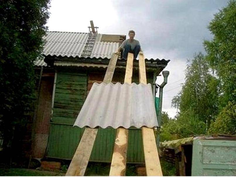 На сарай или гараж, одно- или двускатный, шифер можно поднять по лестнице. Для этого используют приставную лестницу или устанавливают два наклонных бруса параллельно друг другу. Лист укладывают на бруски, обвязывают двумя веревками, скрепляя их на середине листа, и поднимают по направляющим. Можно сделать это и вручную, если разместить рядом вторую лестницу для подъема людей.