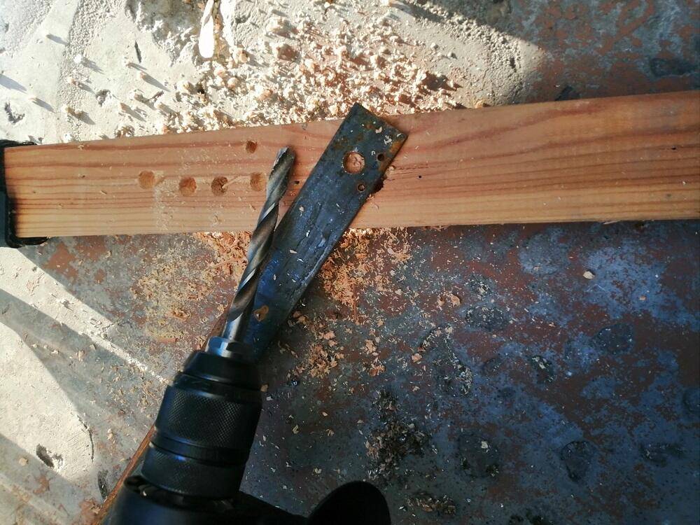 Сверху по центру на доске, используя саморезы и алюминиевые пластины, закрепите дрель. Прибор должен располагаться вдоль рабочего элемента, то есть деревянной доски
