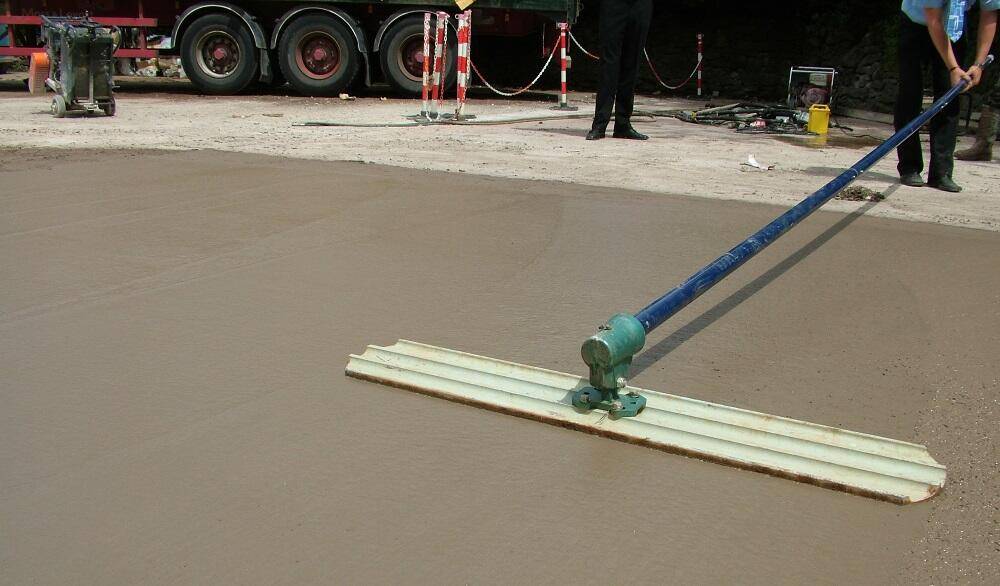 Если смесь в некоторых местах проседает ниже заданного уровня, в эти области отдельно добавляются небольшие порции раствора до выравнивания согласно заданному уровню.