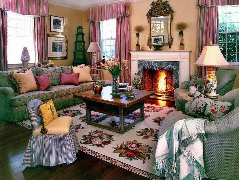 - разнообразие узоров обивки и драпировки (часто для обивки кресел или дивана используется вертикальная полоска или крупный, цветочный принт);