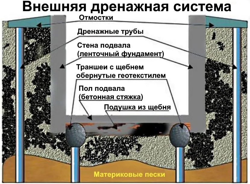 - внешний дренаж – располагается по окружности здания и включает в себя траншеи, трубы, для направления воды в скважину.