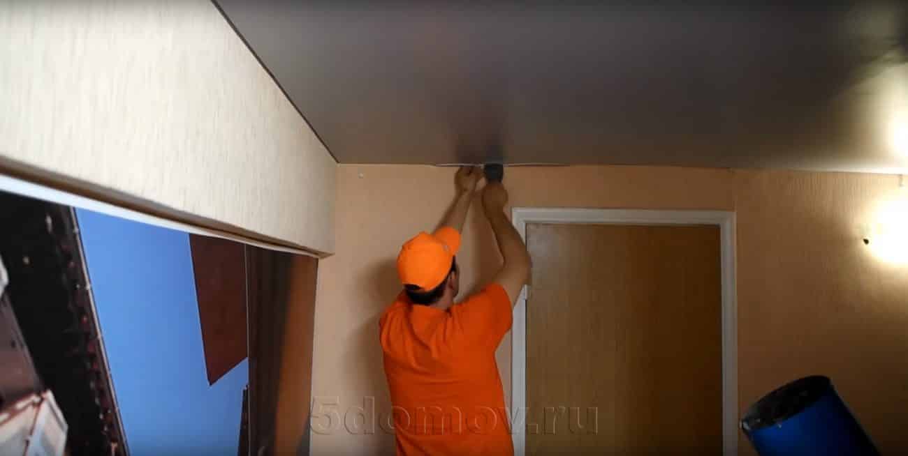 Чтобы вправить пленку обратно, необходимо выровнять отогнутый профиль, поджав саморезы. В качестве инструмента для заправки полотна используется шпатель (его лучше обвернуть в бумажную салфетку). Для устранения провисания используется описанный выше метод нагрева.