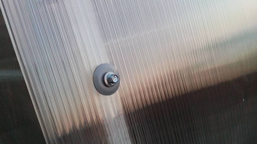 Крепить покрытие на теплицу можно через специальный стыковочный профиль либо на термошайбы, край поликарбоната фиксируется термошайбами в любом случае: