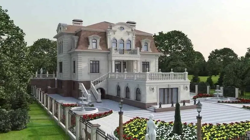 11 спален, золочено-медная крыша, гранитная снаружи и молочно-белая мраморная внутренняя отделки, винный погреб с завидной коллекцией напитков. Банный комплекс на самый капризный вкус (турецкая, русская, финская). Просторный бассейн на нижнем этаже с несколькими купелями покрывает звездный свод из восточной сказки.