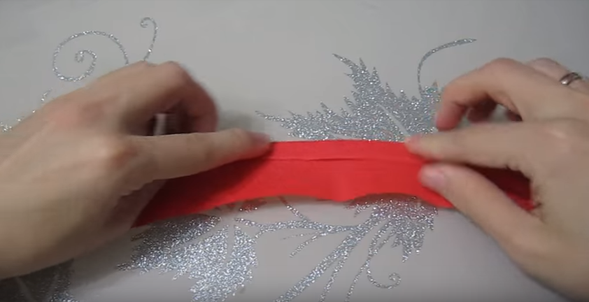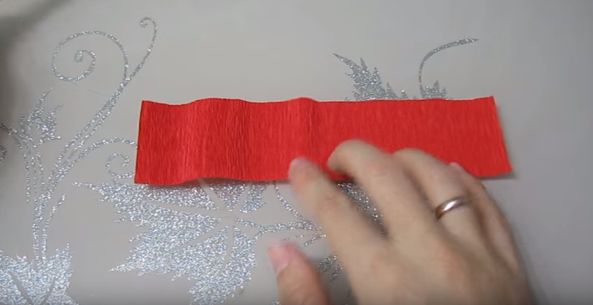3. Дальше нужно сделать кучу розочек из гофрированной бумаги. Для этого отрезаем кусок бумаги длиной 20 см и шириной 5 см (в примере цвет красный, т.к. это розочка. Но для елки мы будем использовать зеленую бумагу)