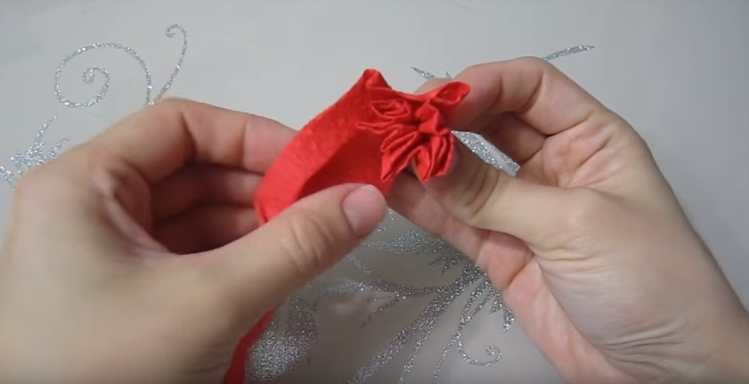 5. Берем полоску с краю и начинаем складывать к ней небольшие «защипы». Здесь тоже не старайтесь выверять ровные куски и делать их одинаковыми. Чем небрежнее защип, тем натуральнее розочка.