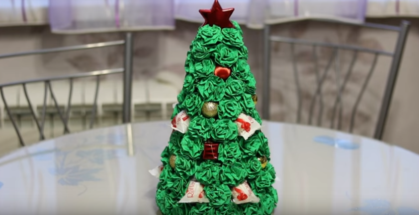 И готово. А вот теперь приготовьтесь — для изготовления такой елки вам потребуется 64 розочки. Да, это довольно кропотливая работа, но она того стоит.