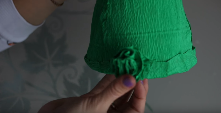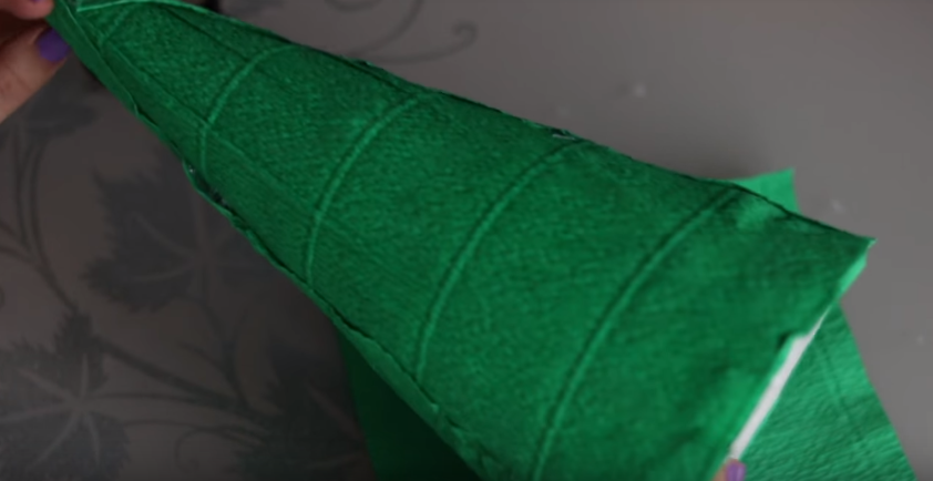 2. Вырезаем фигуру и склеиваем концы, чтобы получился конус. А затем обклеиваем его гофрированной бумагой.