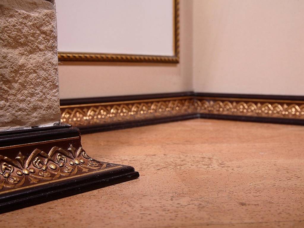 В переводе с греческого «плинтус» — «плита», «цоколь», «кирпич». Изначально это был декоративный элемент для обрамления фасадов мебели, художественных панно, мозаичных или мраморных полов. Изготавливались детали из шпона ценных деревьев, украшались вставками из меди, драгоценных металлов, слоновой кости. Поверхность покрывалась резьбой, перламутром, позолотой.