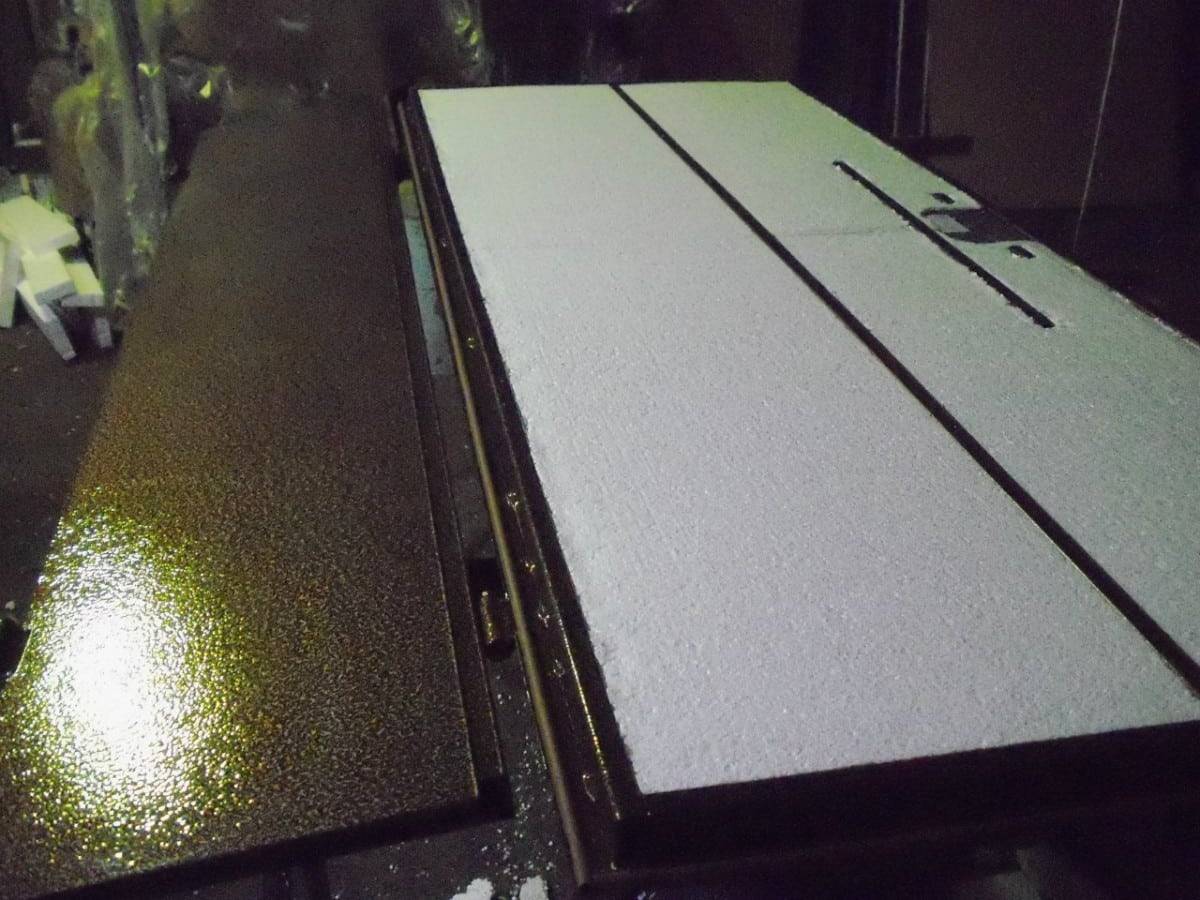 - При помощи ножа панели (плиты) утеплителя нарезаются по размерам полостей в двери и укладываются внутрь. Для улучшения соединения на поверхность пенопласта наносится герметик или силикон (в минимальном, но достаточном для удержания количестве).