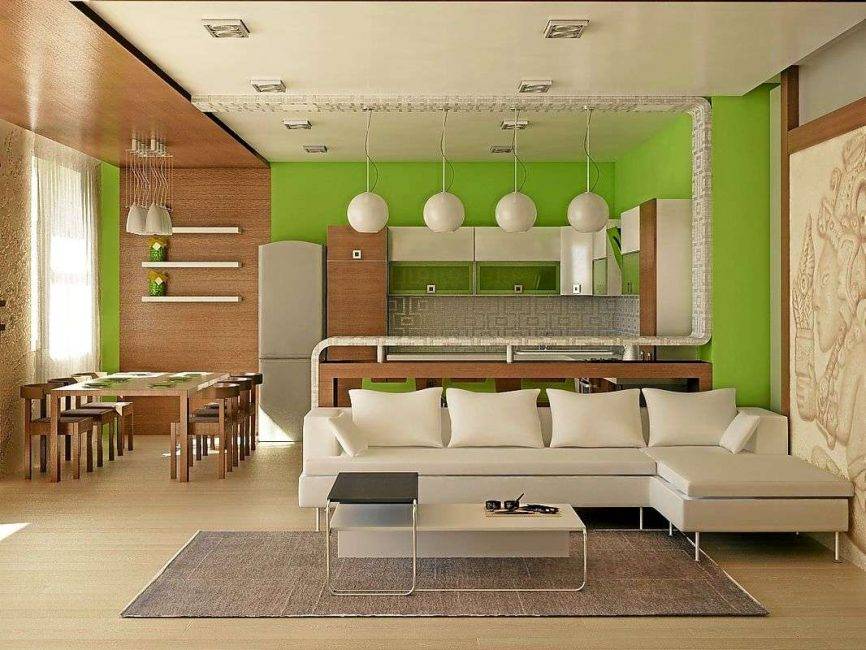 Материалом для ее сооружения чаще всего служит гипсокартон. С помощью такой имитации стены зону кухни можно полностью скрыть. Распространенным вариантом служит установка лишь недлинной стены, на которую можно повесить телевизор.