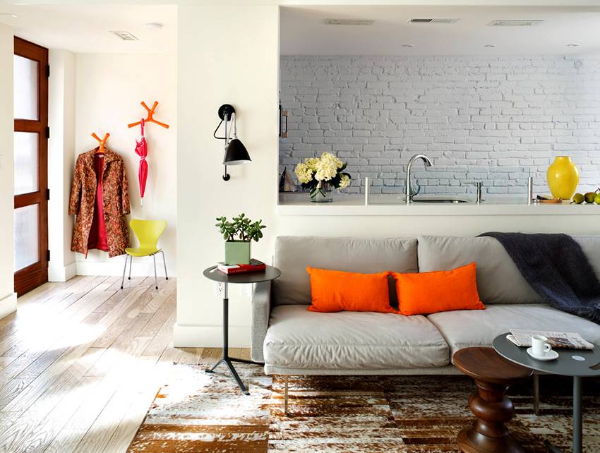 Главное для увеличения площади гостиной – расположить перегораживающую часть максимально ближе к мебели на кухне.