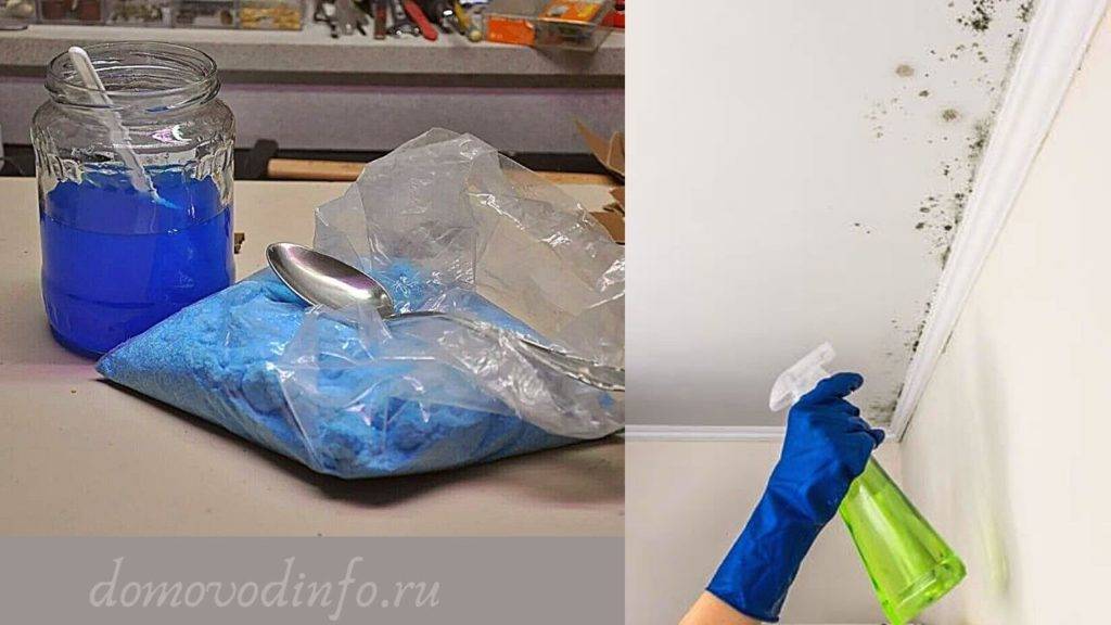 - Медный купорос. 10 г синего порошка смешивают с 1 л воды. Жидкостью смазывают стены, оставляют на несколько часов, а затем смывают водой.