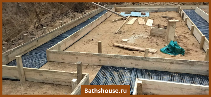 На нужном участке размечается внешний контур здания, внутренняя часть отмеченной территории освобождается от плодородного слоя земли. Затем, выполняется засыпка подушки из песка, щебня, устилается площадь строительного полиэтилена в два слоя, либо рубероида. Изоляцию кладут сильно внахлест.