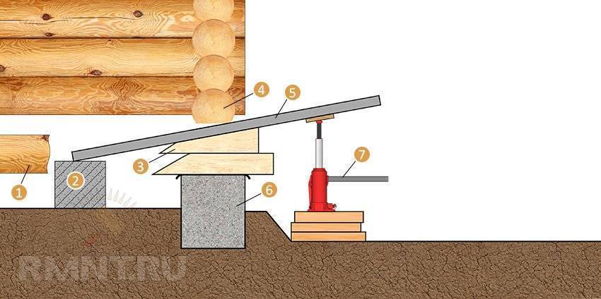 1 – нижнее бревно венца; 2 – опора рычага; 3 – деревянные клинья; 4 – верхнее бревно венца; 5 – рычаг (швеллер); 6 – ленточный фундамент; 7 – домкрат