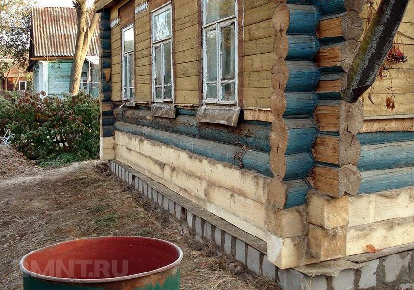 Такой подход применим, если гниение еще не поразило весь нижний пояс бревен. Более того, это единственный способ ремонта деревянного дома в такой ситуации. Для целостности сруба и его жесткости, к сожалению, такой подход ничего хорошего не добавит. «Бонусом» к этим неприятностям станет дополнительная потеря тепла через новые стыки.