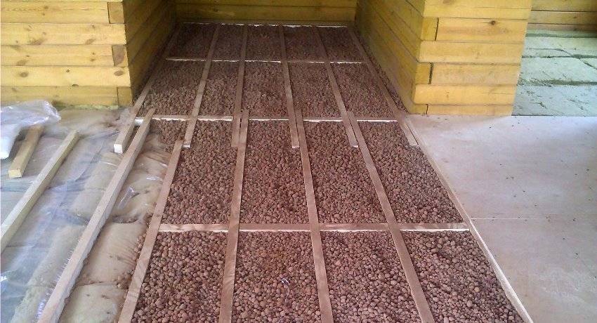 - Керамзит. Вулканизированные пористые шарики из глины засыпаются в пространство между черновым и чистовым полом. Материал обладает отличными изоляционными характеристиками, отличается экологической чистотой, имеет доступную стоимость. Недостаток состоит в том, что со временем уплотняется под действием силы тяжести и утрачивает рабочие качества. Материал нужно периодически менять, для чего придется вскрывать покрытие.