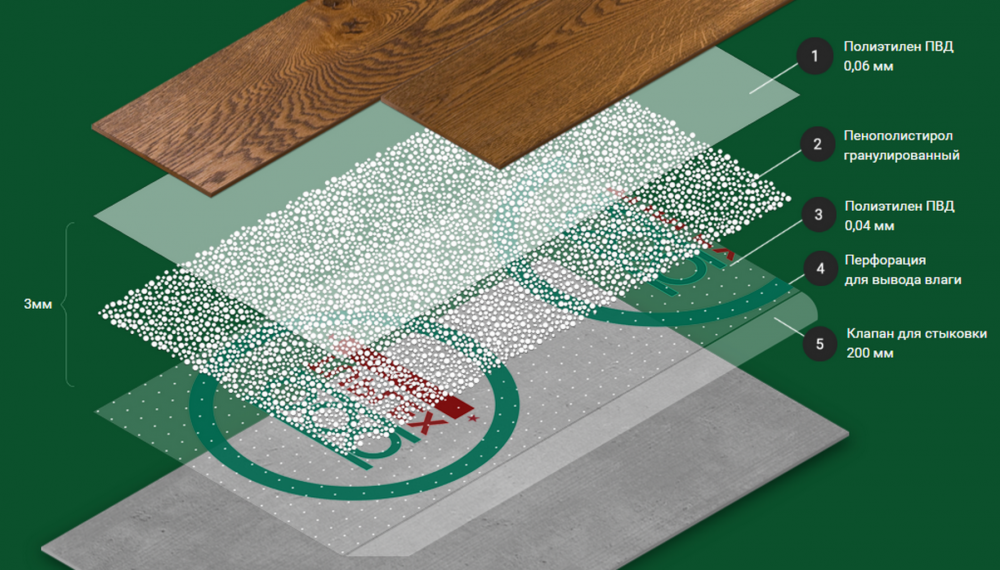 Отличный пример – Tuplex (3 мм). Эта подложка позволяет вентилировать все слоеное пространство. Она состоит из двух прослоек полиэтиленовой пленки, между которыми размещены гранулы пенополистирола. Так, верхняя пленка – полиэтилен высокого давления, задание которого – обеспечить максимальную защиту финишного покрытия от влаги, а также ее паров. Нижняя является более тонкой, так как произведена из другого варианта полиэтилена. Она пропускает влагу между пленками. Влага просачивается между гранулами и выводится, нагружу. Все полотна стыкуются по ширине с использованием нахлеста, который проходит только по одной стороне. Его ширина 20 см.