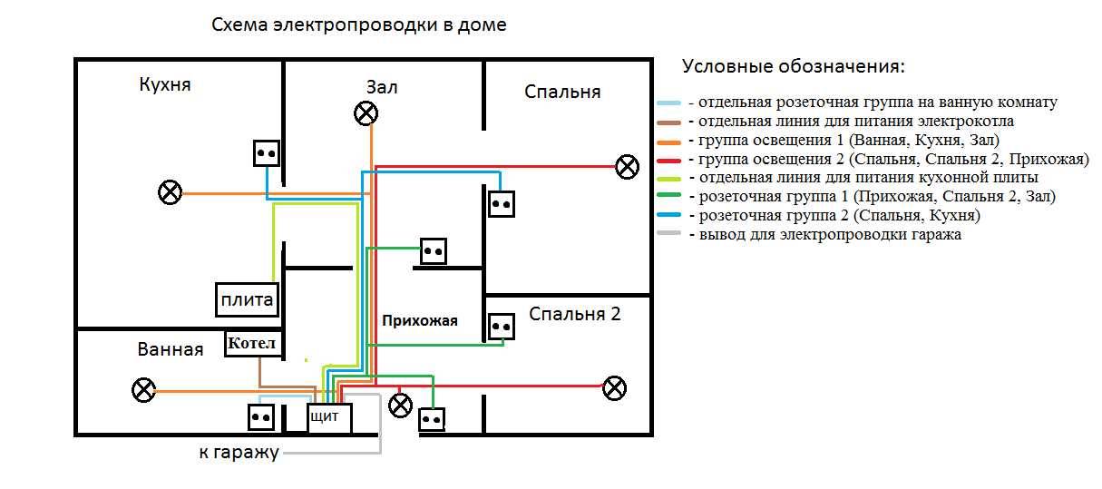 Можно попробовать самостоятельно рассчитать нагрузку на сеть и сделать чертеж. На плане коттеджа отмечают точки расположения выключателей и розеток. Схема показывает месторасположение проводки и прочих элементов электричества